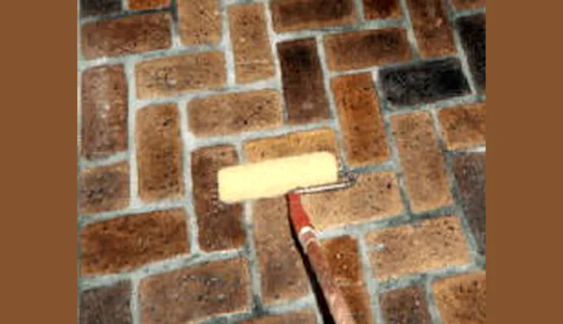 El sellador se vierte en un cubo o bandeja de pintura y se aplica con un rodillo o un cepillo de espuma de poliuretano, intentando cubrir toda la superficie del suelo con una capa fina y uniforme, incluyendo los dos lados de los adoquines y las líneas de lechada existentes entre ellas. Al terminar, la superficie se deja secar completamente.